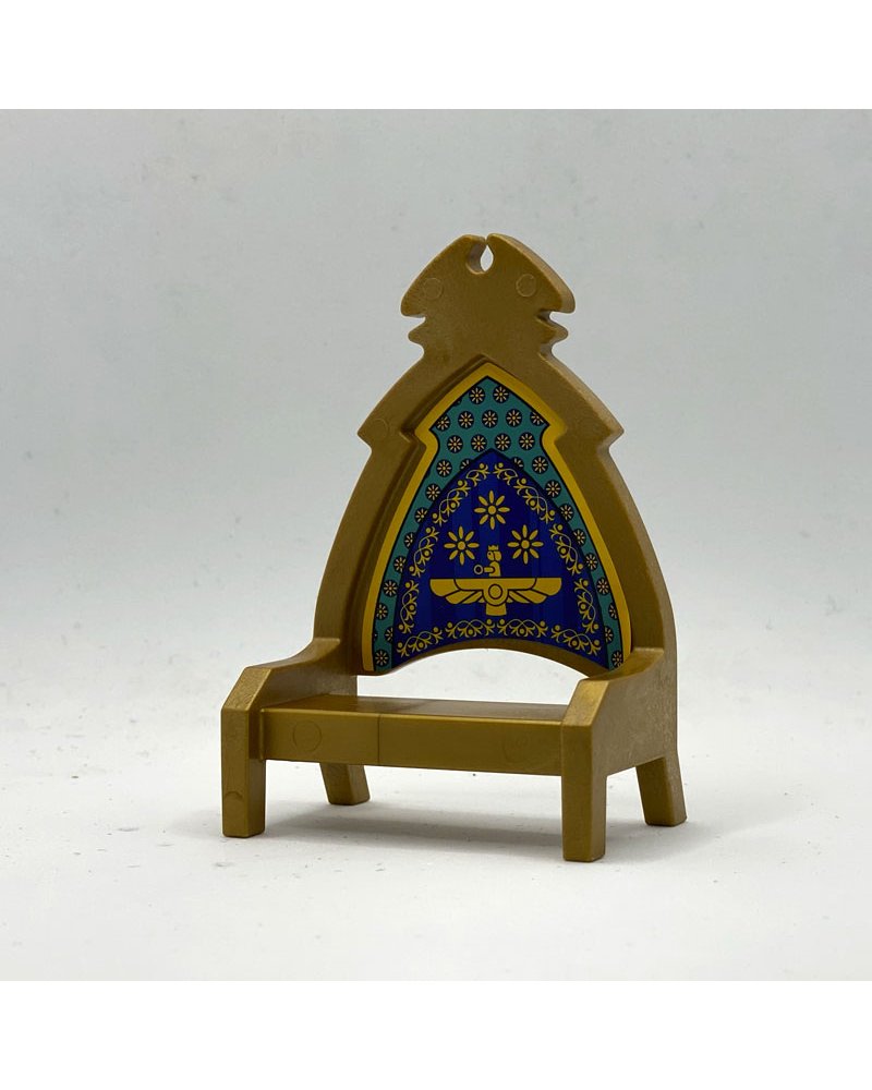 El accesorio de playmobil trono rey dorado OTR151, está compuesta por trono dorado, el asiento del trono lleva una imágenes en azul claro y oscuro.
