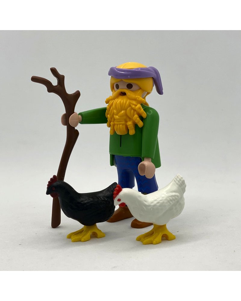 El Playmobil pastor con gallinas, está compuesta por la figura de pastor, un bastón y le acompaña una gallina blanca y una gallina negra.