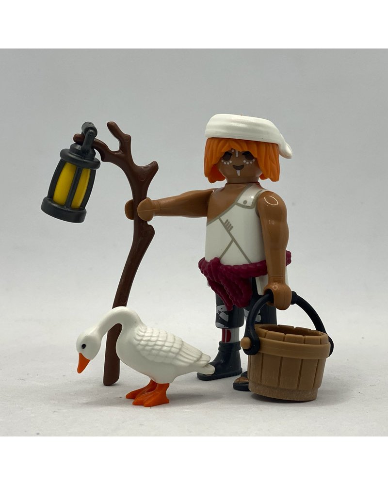 El Playmobil aldeano con oca blanca, está compuesta por la figura pastor pelirrojo con su cinturón, pañuelo en la cabeza de color blanco, le acompaña como complementos un bastón con un farol de aceite, un cubo simulando la madera y una oca blanca.