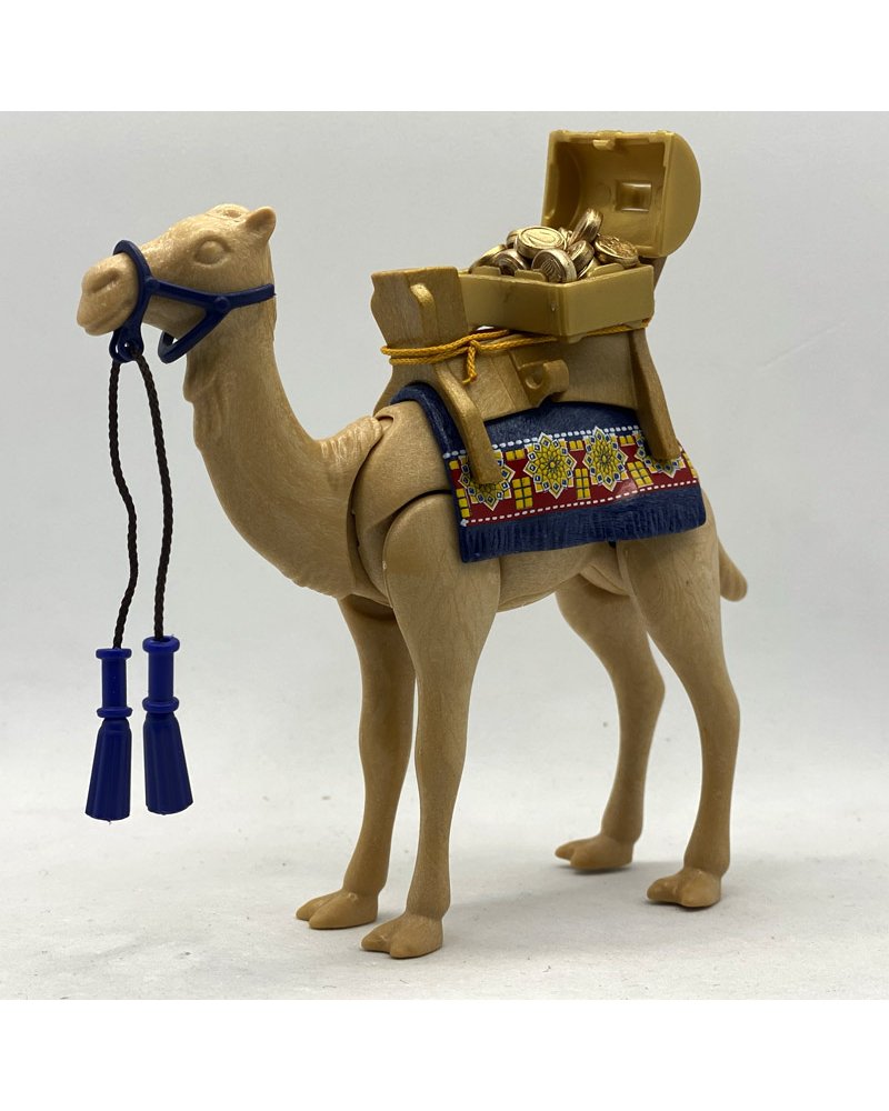 El playmobil camello con accesorios, es un dromedario que lleva incluido la silla de montar con un cofre lleno de monedas de oro, también viene con el bozal y una cuerda para poder dirigir al camello