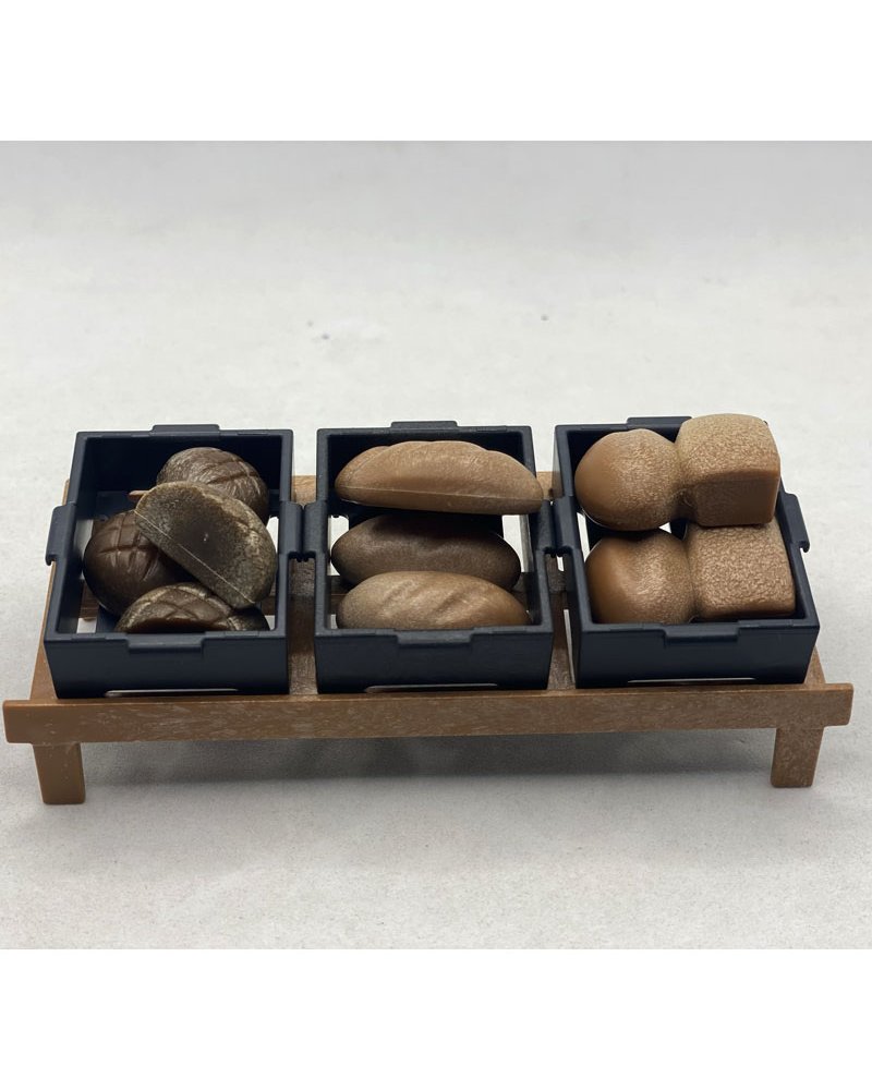 El playmobil puesto mercado pan OTR135, incluye puesto de mercado con tres cajas, seis packs de pan. Está compuestos por panes de distinta forma, cada cajón tiene un tipo de pan distinto.