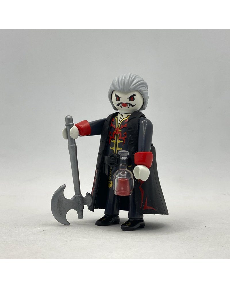El playmobil Drácula FCO784, el vampiro, con su característica cabeza blanca, donde puede apreciar los colmillos, está acompañado por una gabardina larga y negra, dos muñequeras rojas, un hacha y una botella llena de sangre.