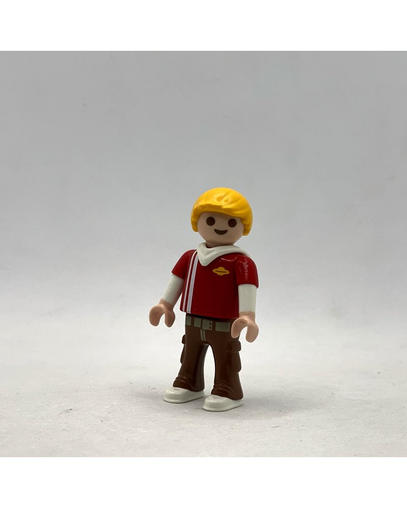 El playmobil niño rubio FIG247, va acompañado con pantalón marrón y unas zapatillas blancas, una sudadera roja con capucha blanca, las mangas cortas de color blanco y color del pelo amarillo.