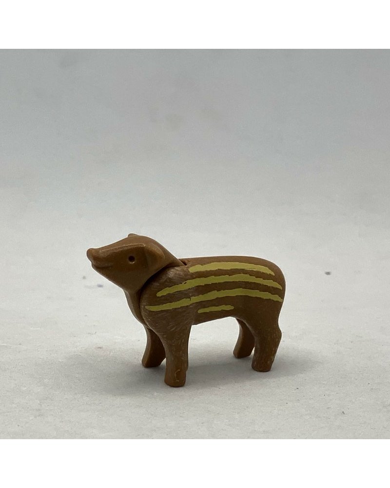 El playmobil jabato jabalí bebé ANI222, tes de color marrón clarito y tiene rayas amarillas en su cuerpo.