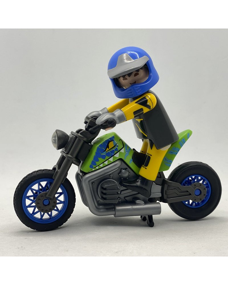 Playmobil motorista, acompañado con su casco azul con visera, con su traje tipo mono de color amarillo y su impresionante moto con dos tubos de escape.