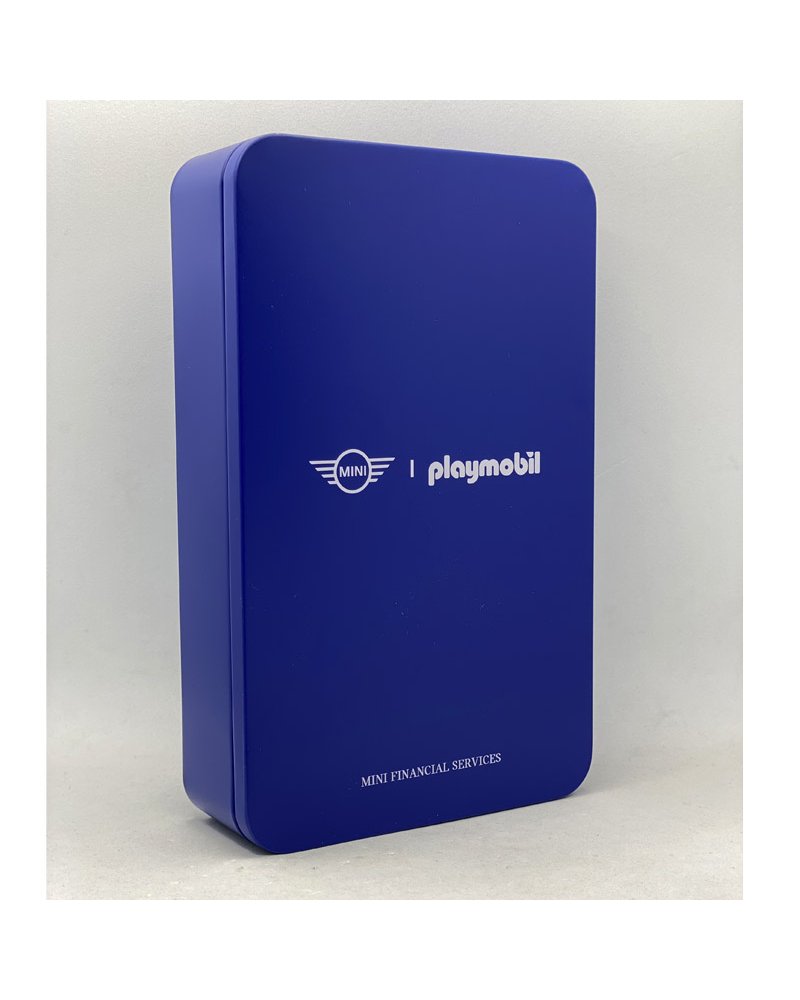 La caja exclusiva de playmobil llavero promocional Mini, está fabricada en metal y contiene un llavero de un conductor promocional, y así vez lleva otro llavero con una cinta donde aparece la frase "Playmobil"