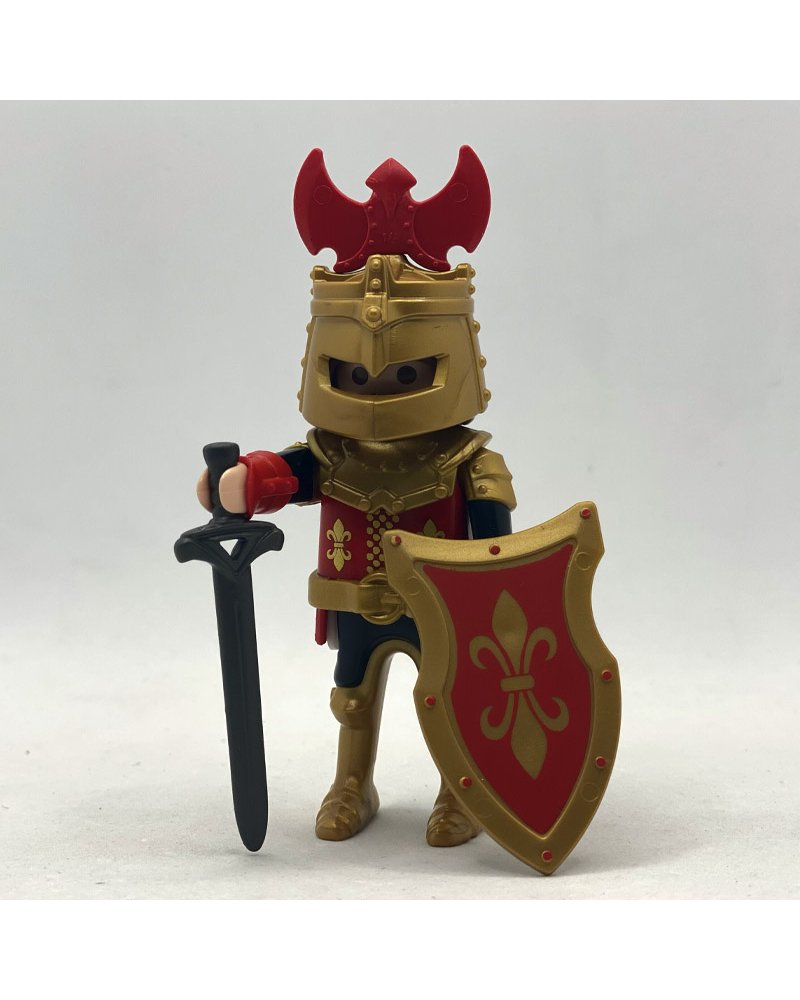 El playmobil caballero medieval rojo, viene armado con un casco dorado, escudo y espada.