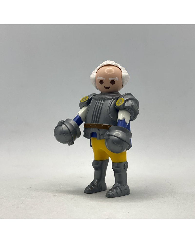 El playmobil medieval anciano, viene acompañado con su armadura y dos puños de acero.