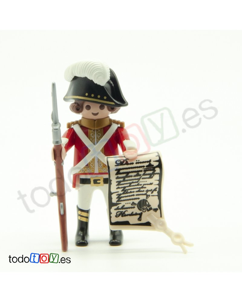 El Playmobil Soldado inglés con escrito FCO074, compuesto con su unirme casaca roja, unas trinchas blancas en forma de X, un gorro con pluma blanca, un mosquetón con bayoneta y un pergamino