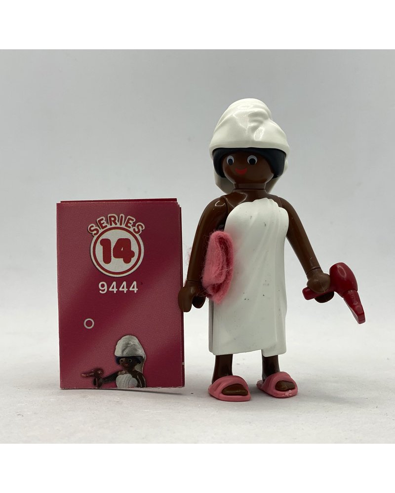 El Playmobil bañista serie 14 chicas 9444, va acompañada de una toalla blanca que la envuelve y una toalla blanca, también lleva un secador. Referencia 9444.