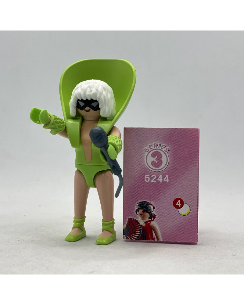 El Playmobil Lady Gaga serie 3 chicas 5244, acompañado por su traje de fiesta color verde y micrófono.