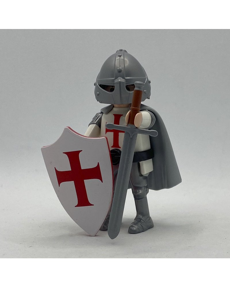 El playmobil templario con capa FCO393, es una figura de la categoría medieval. Está compuesto con una cruz roja en el torso blanco, le acompaña un casco en color gris y una capa.